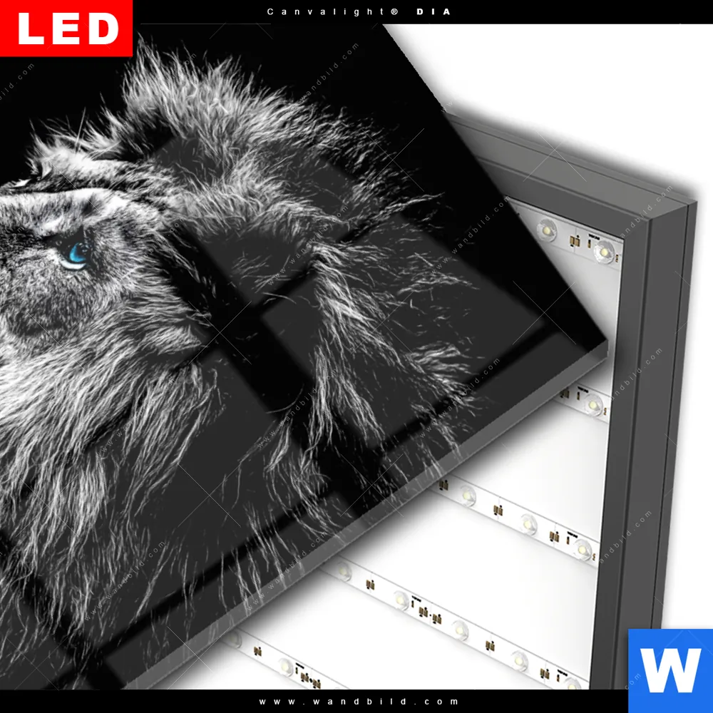 Wechselmotiv Acrylglas Canvalight® DIA | Löwe mit blauen Augen | Hochformat
