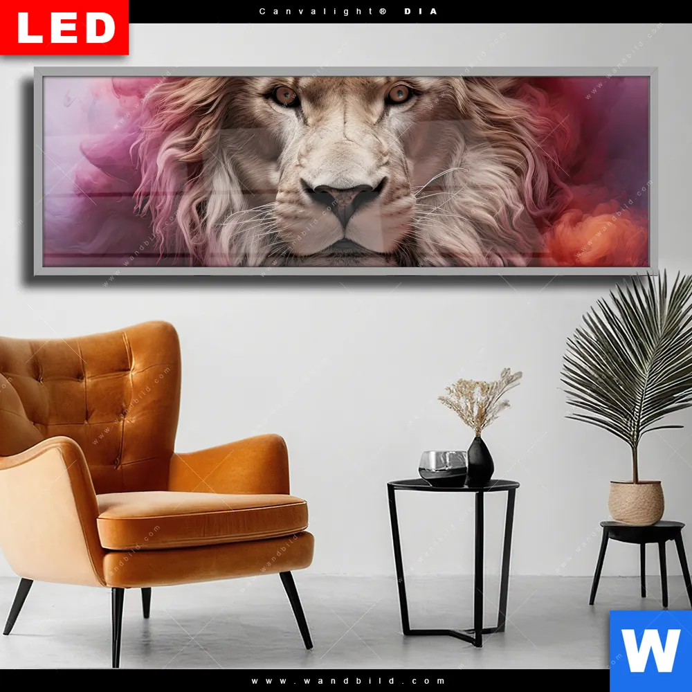 Wechselmotiv Acrylglas Canvalight® DIA | Löwengesicht in buntem Rauch | Panorama