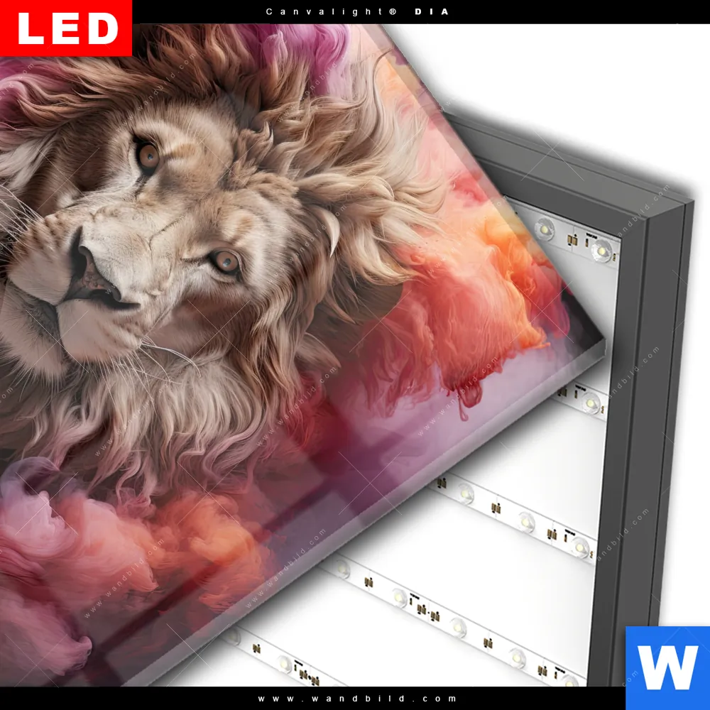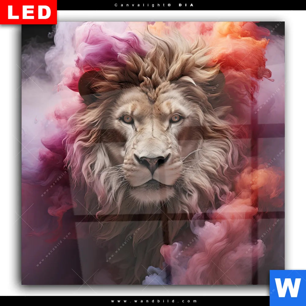 Wechselmotiv Acrylglas Canvalight® DIA | Löwengesicht in buntem Rauch | Quadrat