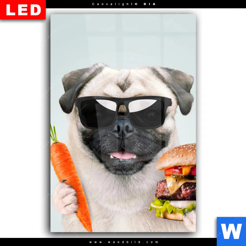 Wechselmotiv Acrylglas Canvalight® DIA | Lustiger Hund mit Burger | Hochformat