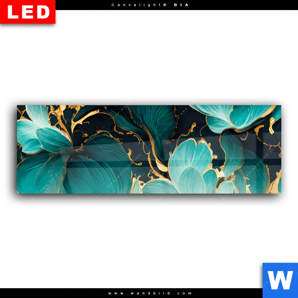 Wechselmotiv Acrylglas Canvalight® DIA | Marmor Blüten in türkis & gold | Panorama