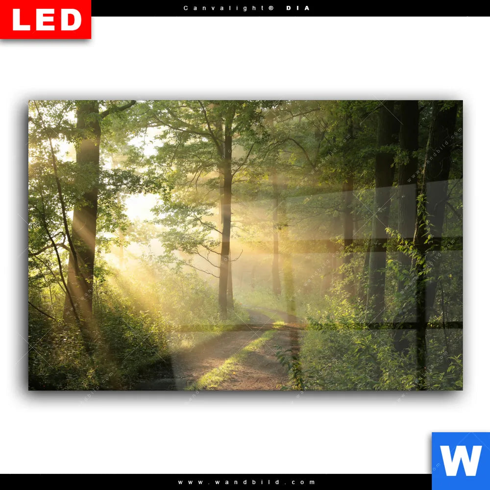 Wechselmotiv Acrylglas Canvalight® DIA | Morgenspaziergang im nebeligem Wald | Querformat