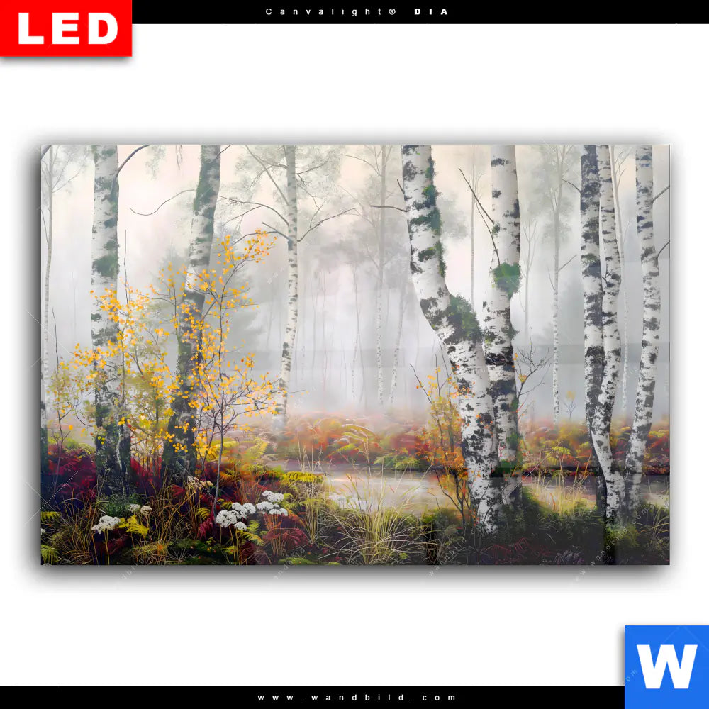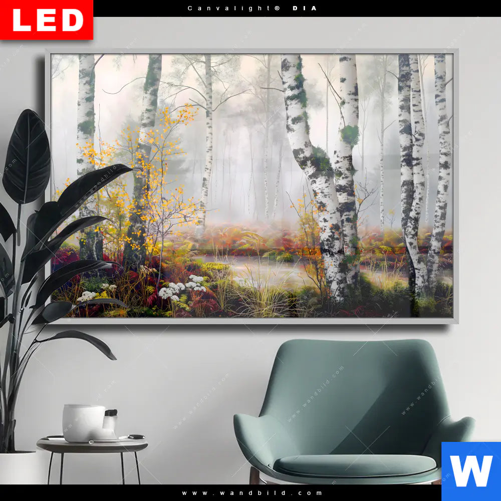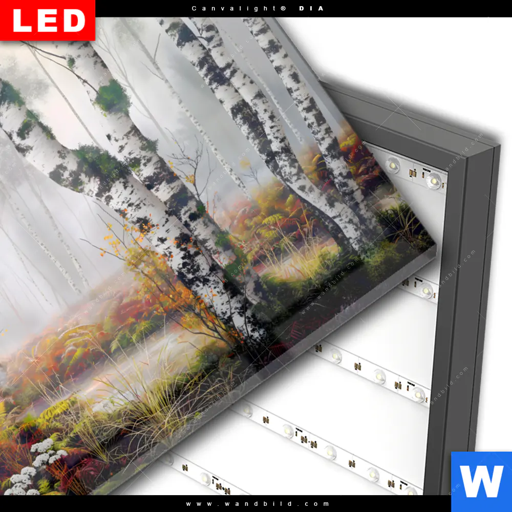 Wechselmotiv Acrylglas Canvalight® DIA | Naturidylle - Birken im Nebel | Querformat