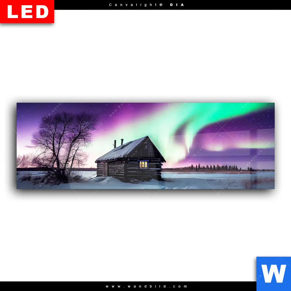Wechselmotiv Acrylglas Canvalight® DIA | Nordlichter über einem Holzhaus | Panorama