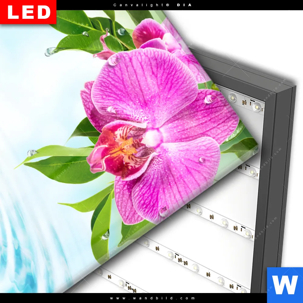 Wechselmotiv Acrylglas Canvalight® DIA | Orchidee & Wassertropfen | Hochformat
