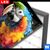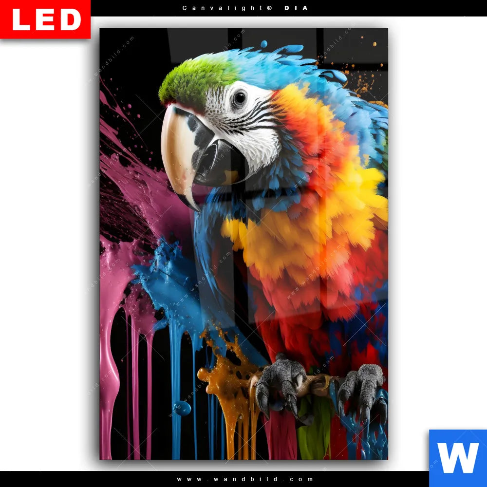Wechselmotiv Acrylglas Canvalight® DIA | Papagei mit bunten Farbspritzern | Hochformat