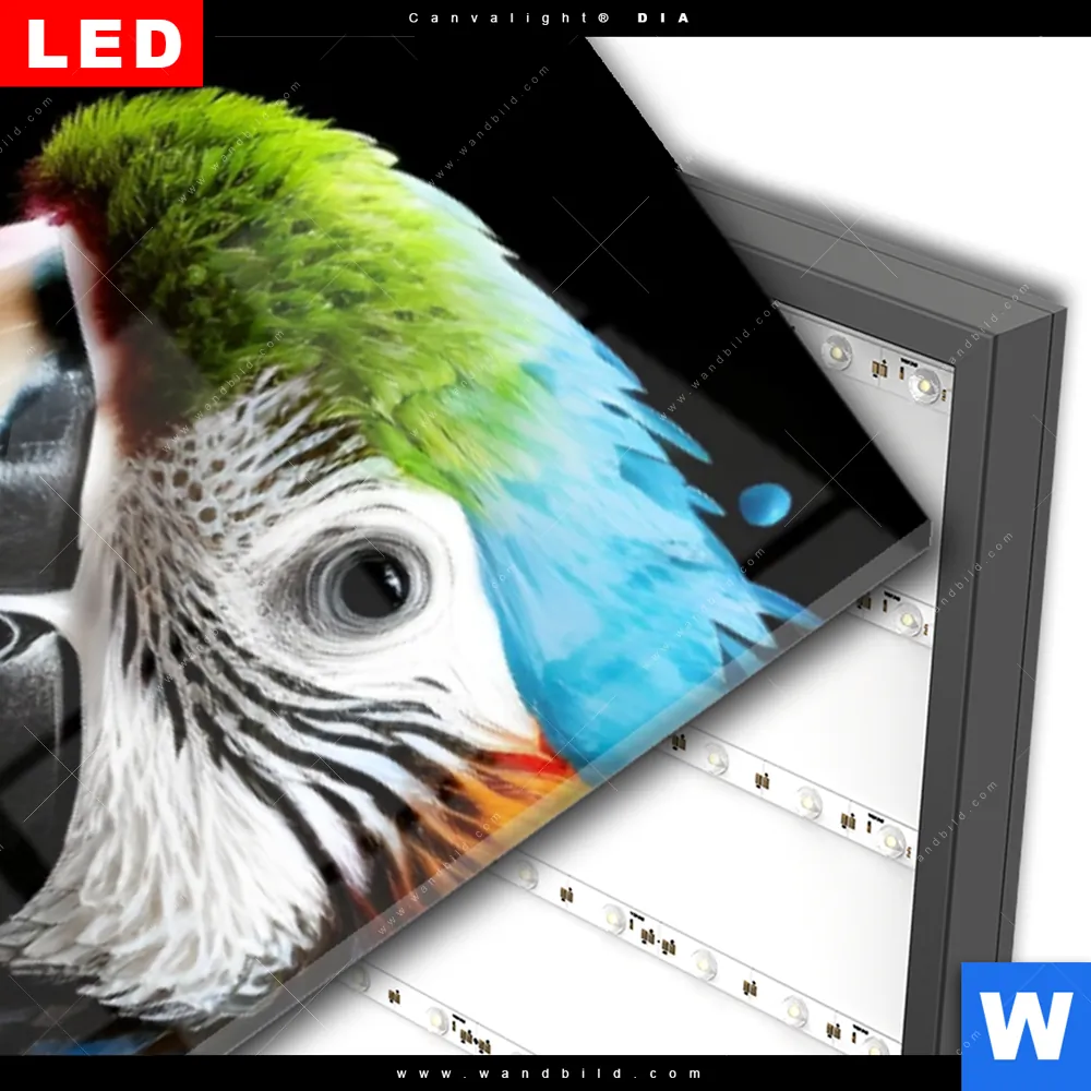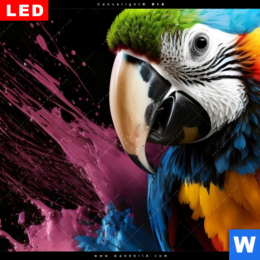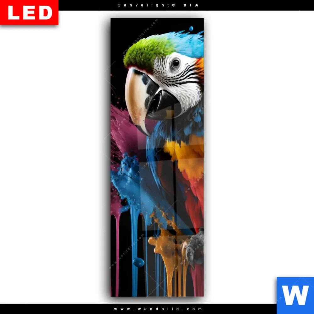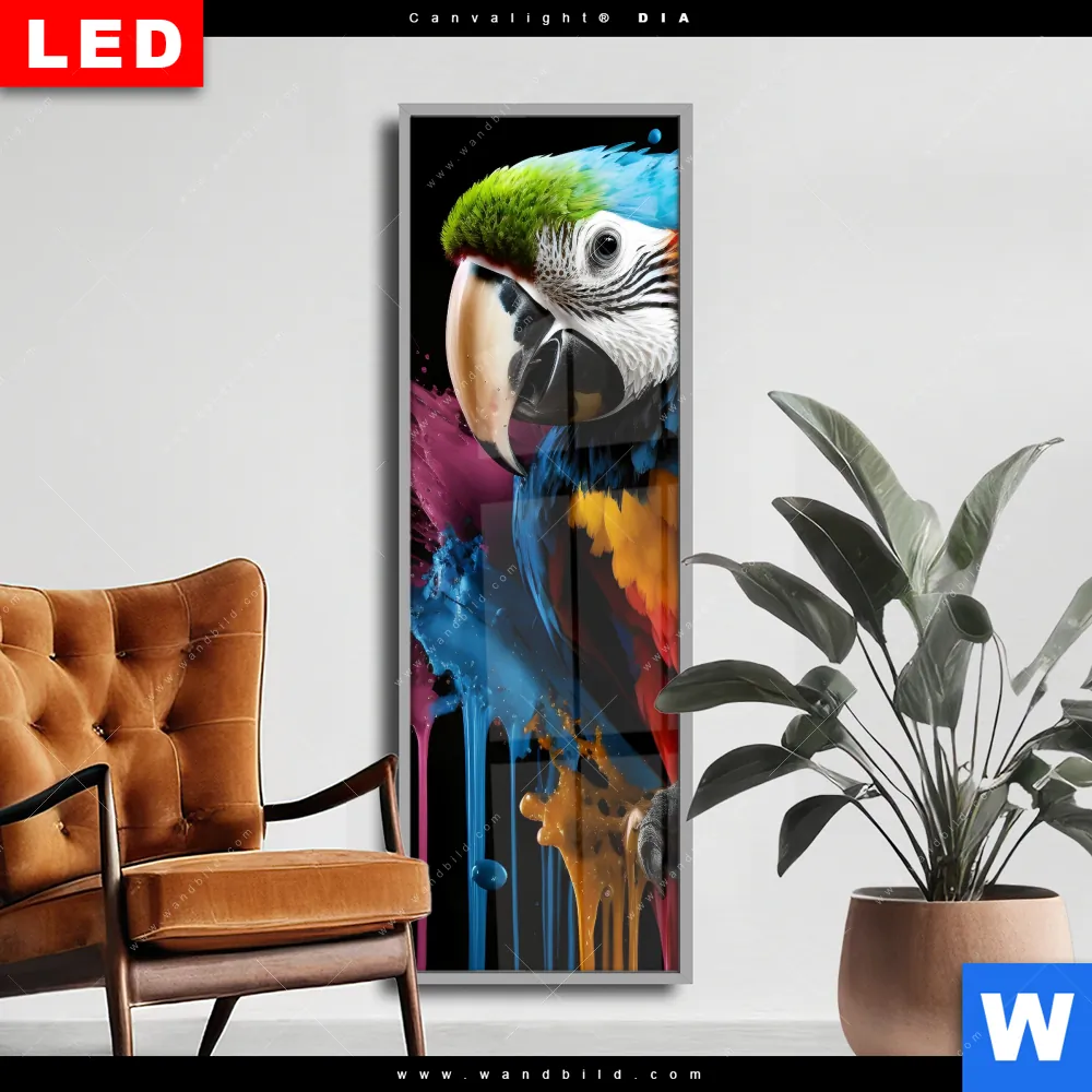 Wechselmotiv Acrylglas Canvalight® DIA | Papagei mit bunten Farbspritzern | Schmal
