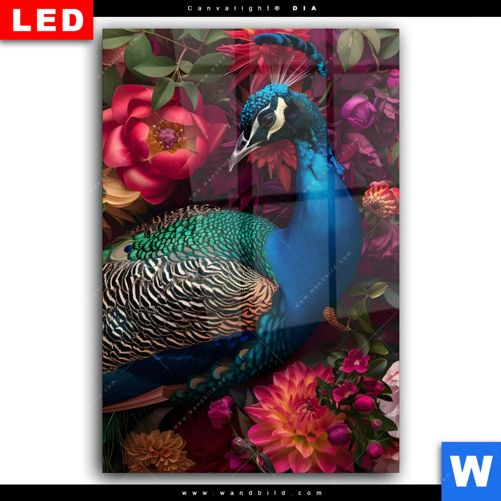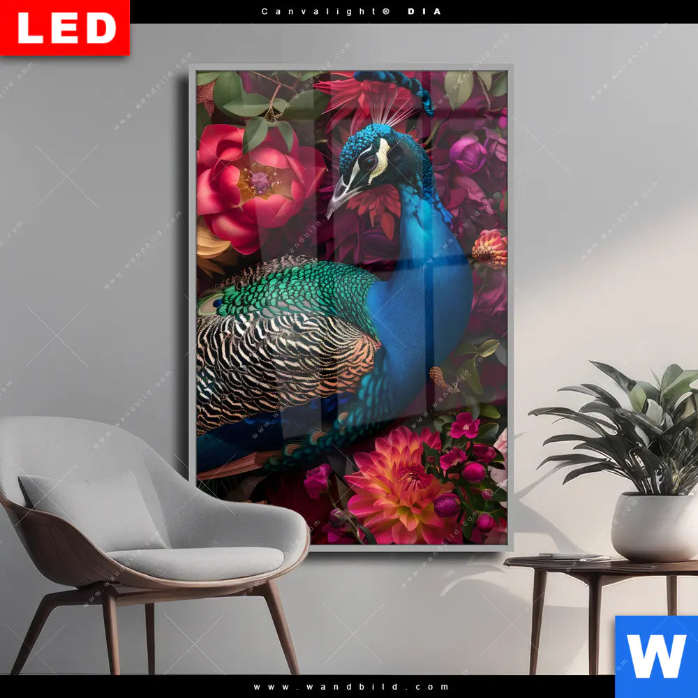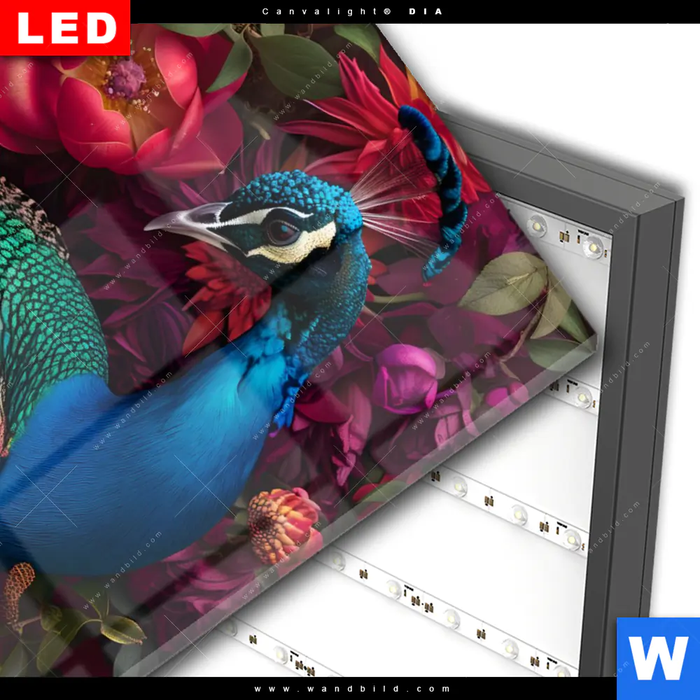 Wechselmotiv Acrylglas Canvalight® DIA | Prachtvoller Pfau und Blüten | Hochformat