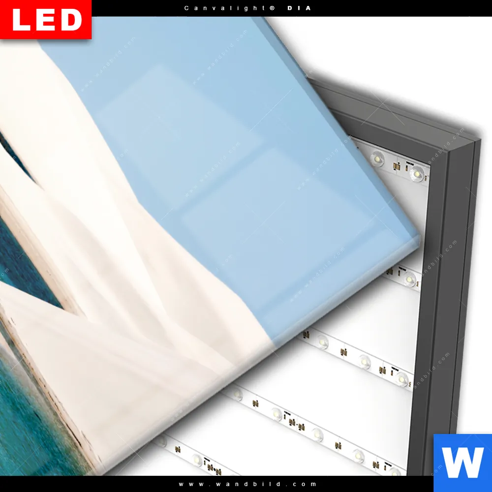BEACHTE: Du solltest bereits ein Canvalight® DIA Leuchtbild mit austauschbarem Acrylglas-Motiv besitzen! Im Lieferumfang ist nur ein Wechsel-Acrylglas-Druck ohne Leuchtrahmen enthalten. Der Abdeckwinkel im Frontbereich des LED Bildes deckt umlaufend ca. 19 mm des Motives ab. Bei eigenen Motiven bitte darauf achten, wichtige Elemente in ausreichender Entfernung vom Rand zu platzieren, damit diese nicht verdeckt werden.