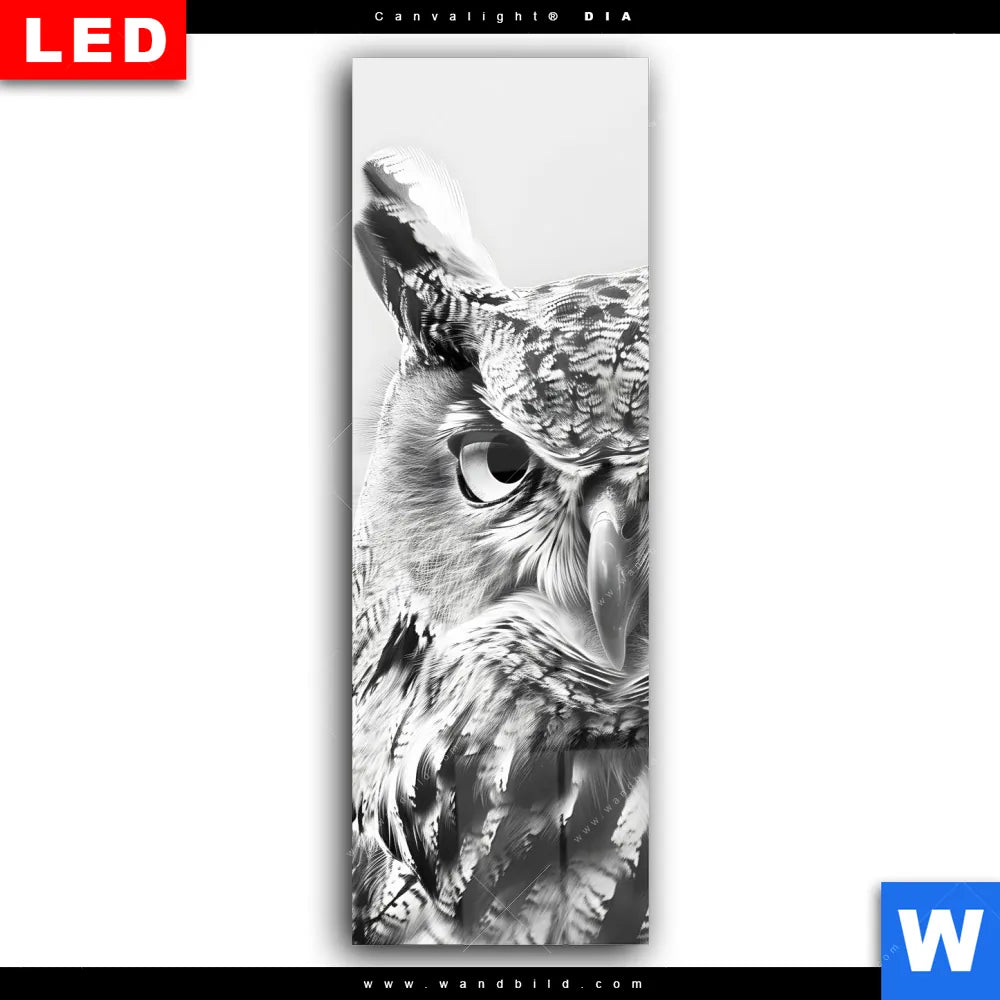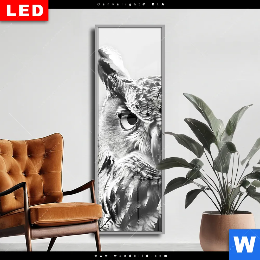 Wechselmotiv Acrylglas Canvalight® DIA | Schwarz-Weiß Eulenportrait | Schmal