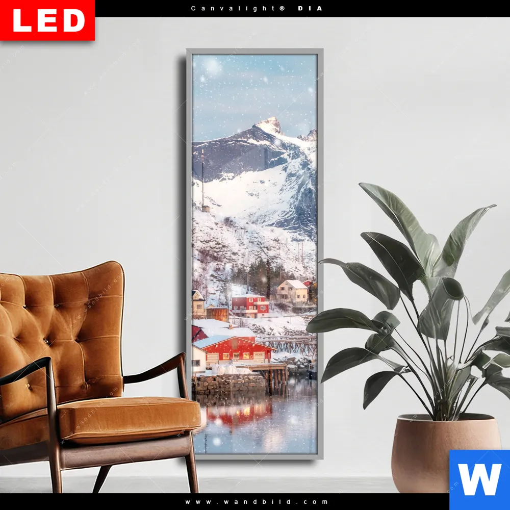 Wechselmotiv Acrylglas Canvalight® DIA | Skandinavisches Dorf im Schnee | Schmal