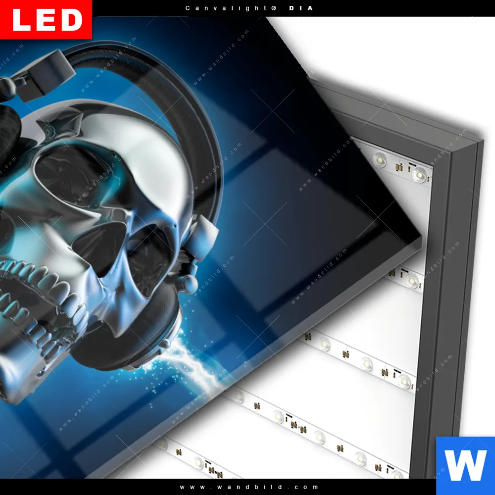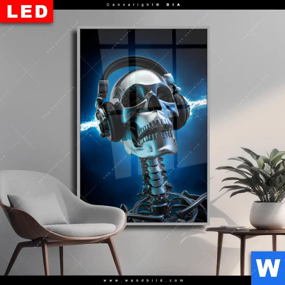 Wechselmotiv Acrylglas Canvalight® DIA | Skelett & Kopfhörer | Hochformat