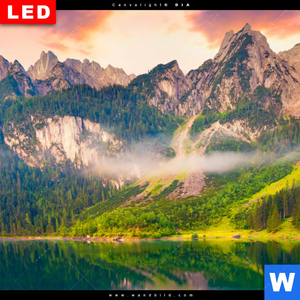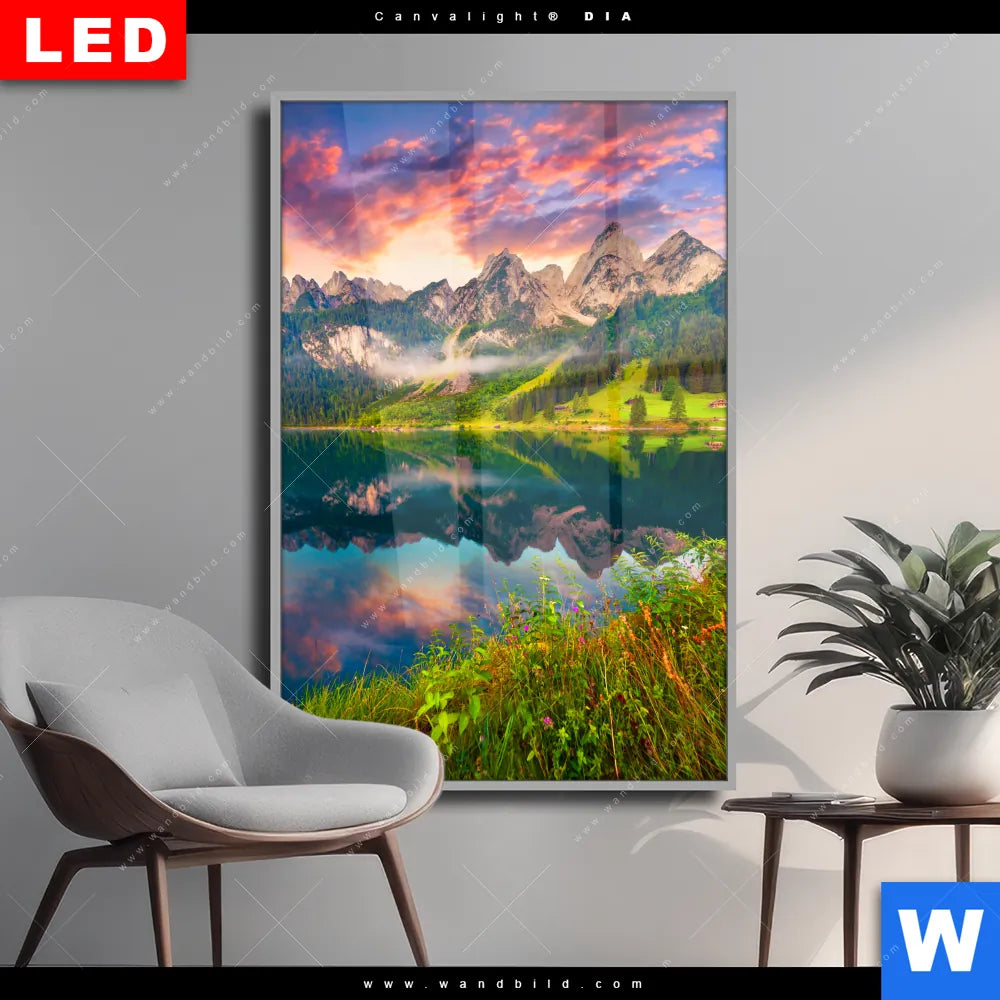 Wechselmotiv Acrylglas Canvalight® DIA | Sonnenaufgang am Bergsee | Hochformat