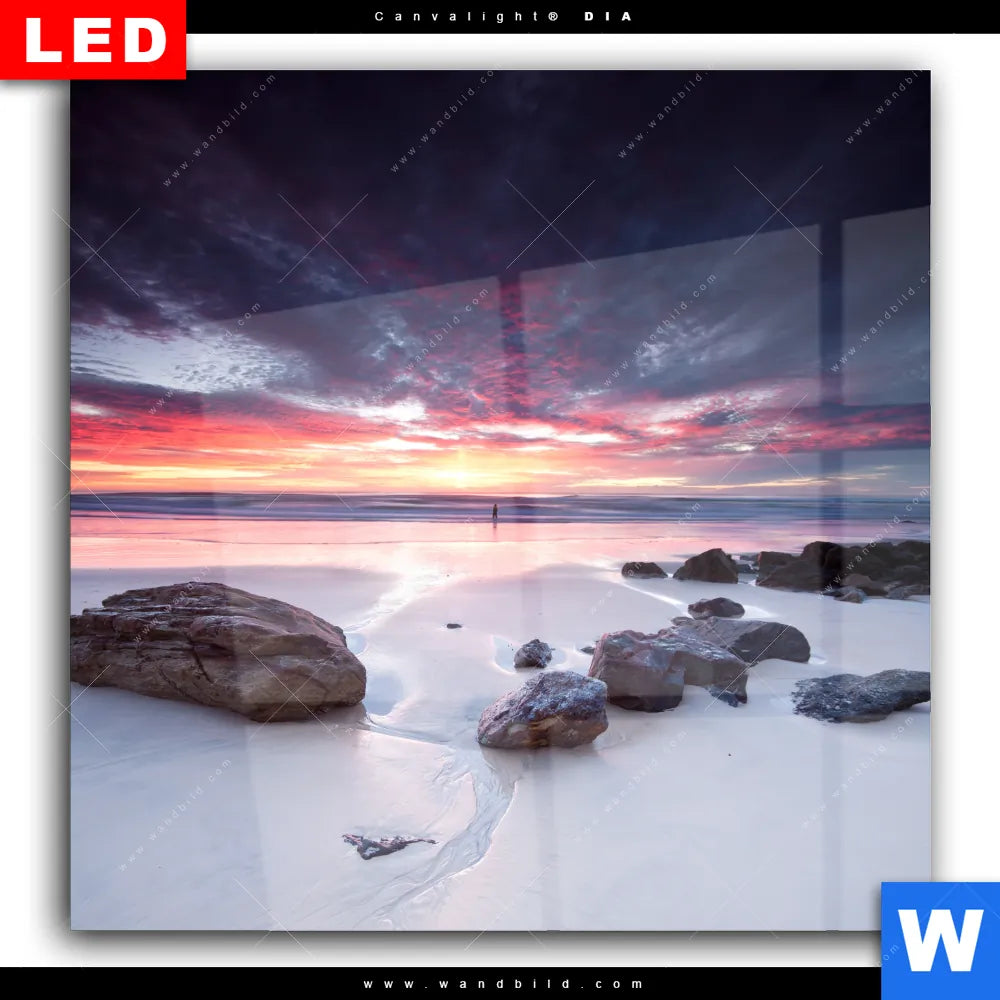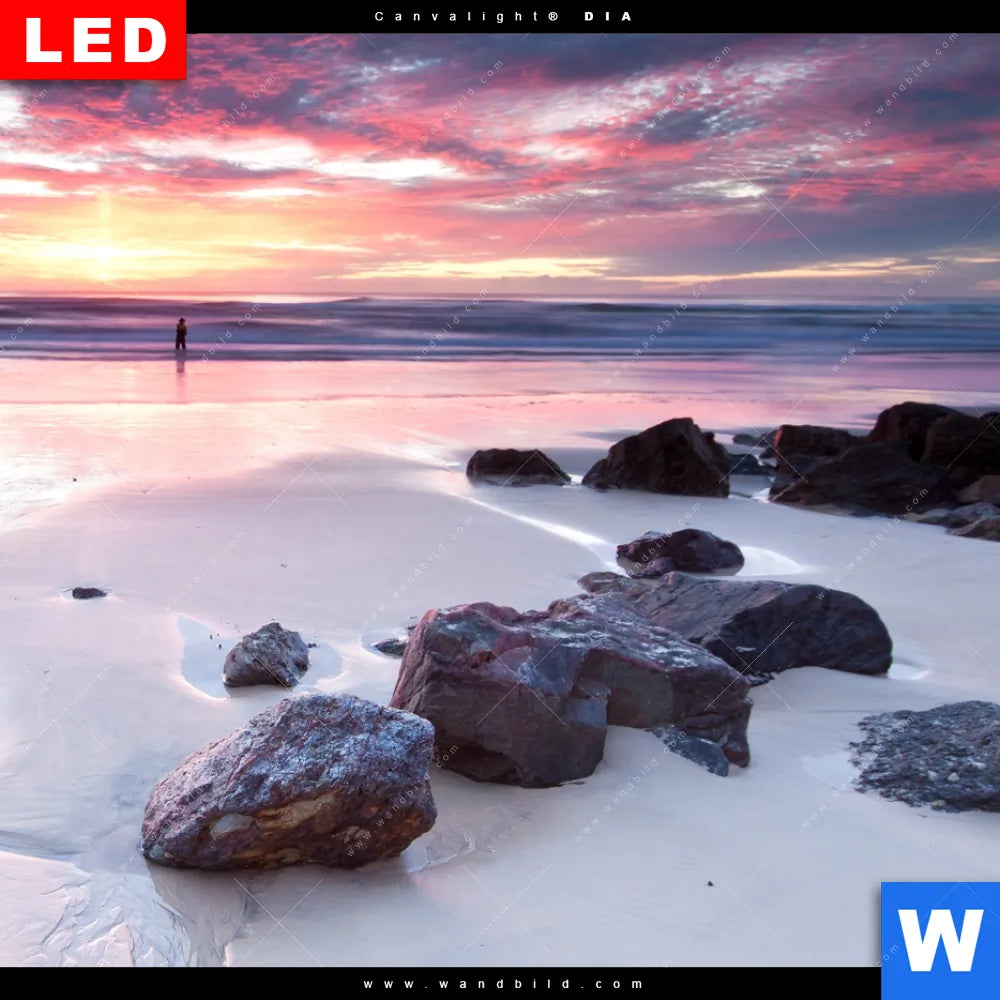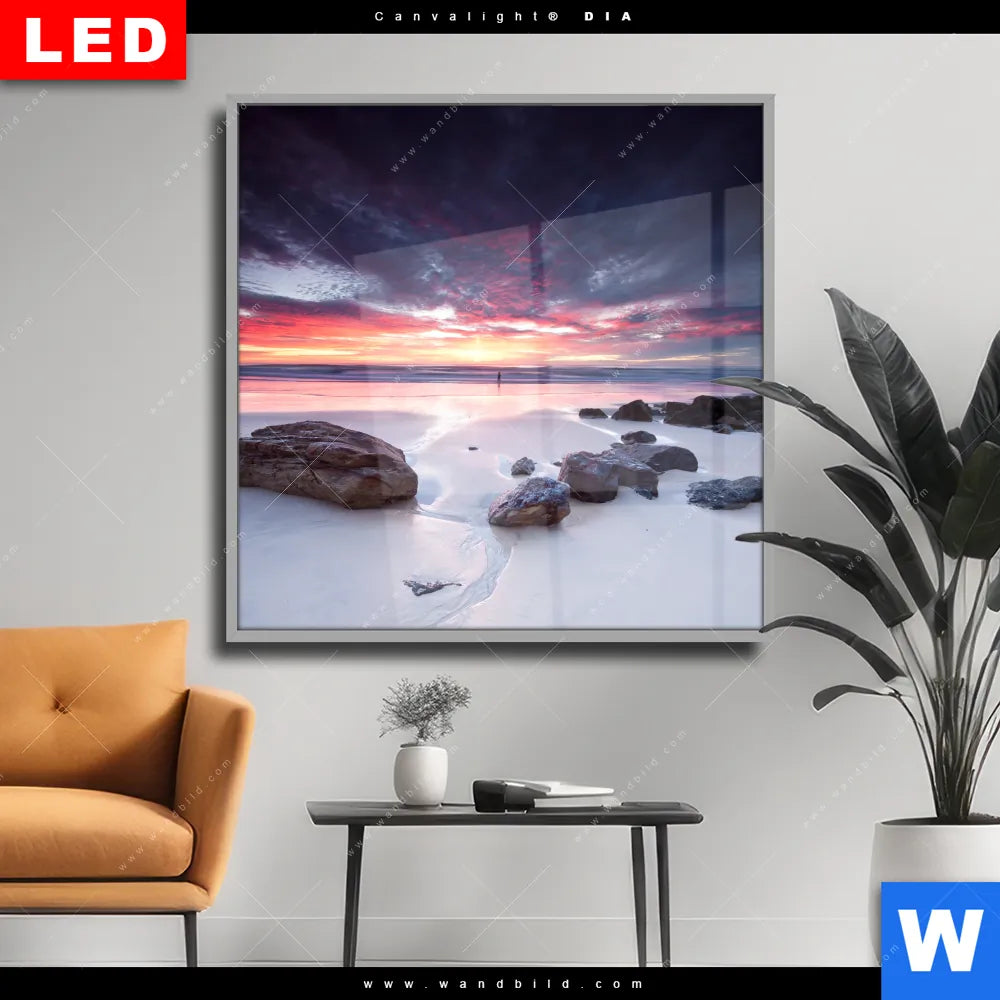 Wechselmotiv Acrylglas Canvalight® DIA | Sonnenaufgang am Strand mit Felsen | Quadrat