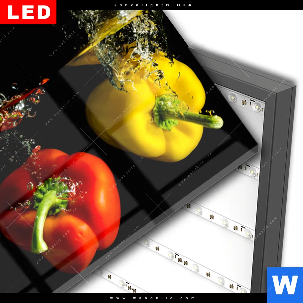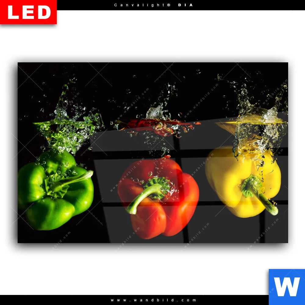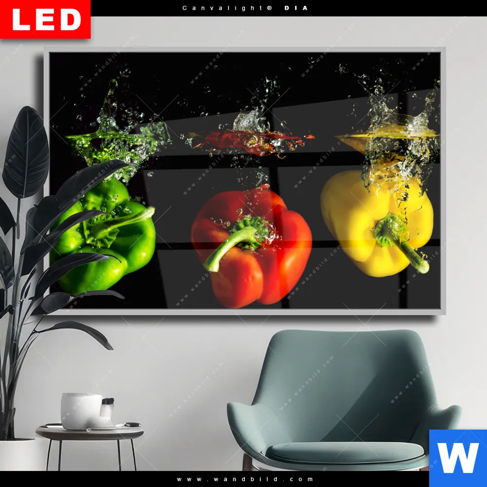 Wechselmotiv Acrylglas Canvalight® DIA | Spritzer von Paprika beim fallen ins Wasser | Querformat