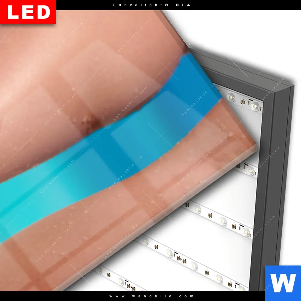 BEACHTE: Du solltest bereits ein Canvalight® DIA Leuchtbild mit austauschbarem Acrylglas-Motiv besitzen! Im Lieferumfang ist nur ein Wechsel-Acrylglas-Druck ohne Leuchtrahmen enthalten. Der Abdeckwinkel im Frontbereich des LED Bildes deckt umlaufend ca. 19 mm des Motives ab. Bei eigenen Motiven bitte darauf achten, wichtige Elemente in ausreichender Entfernung vom Rand zu platzieren, damit diese nicht verdeckt werden.