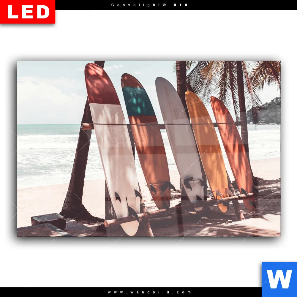 Wechselmotiv Acrylglas Canvalight® DIA | Surfbretter und Palmen | Querformat