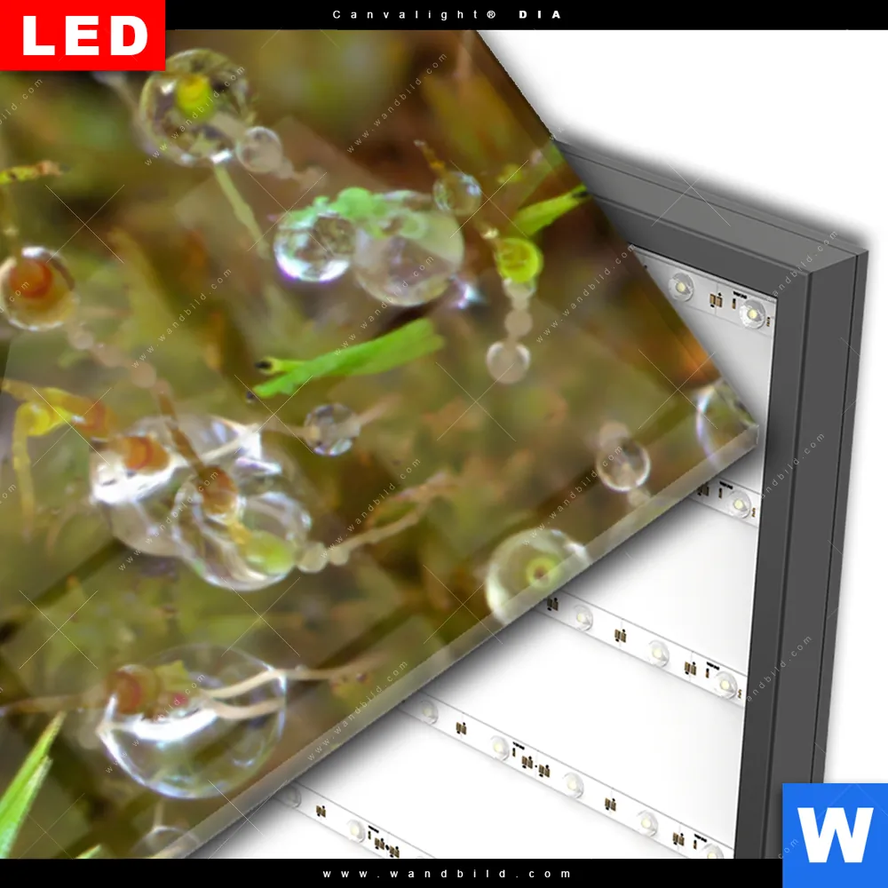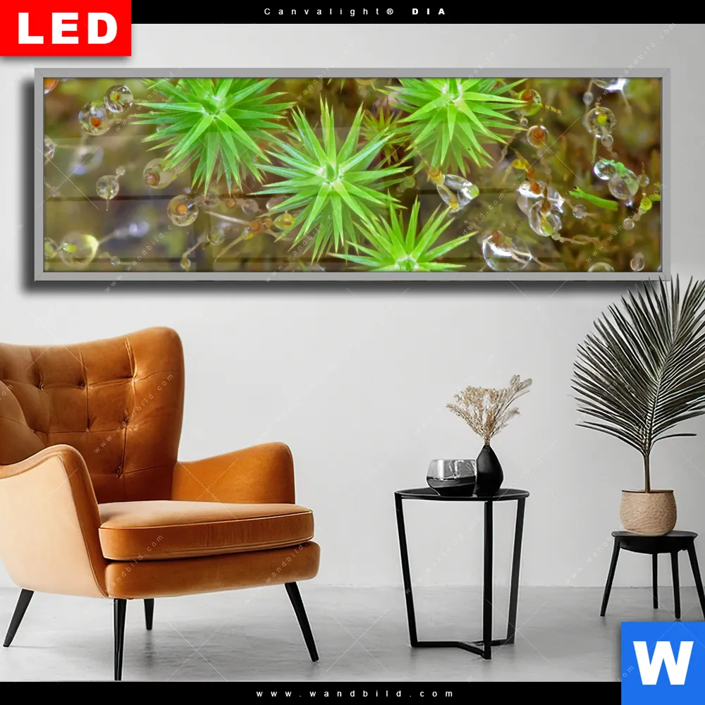 Wechselmotiv Acrylglas Canvalight® DIA | Tautropfen auf Moos | Panorama