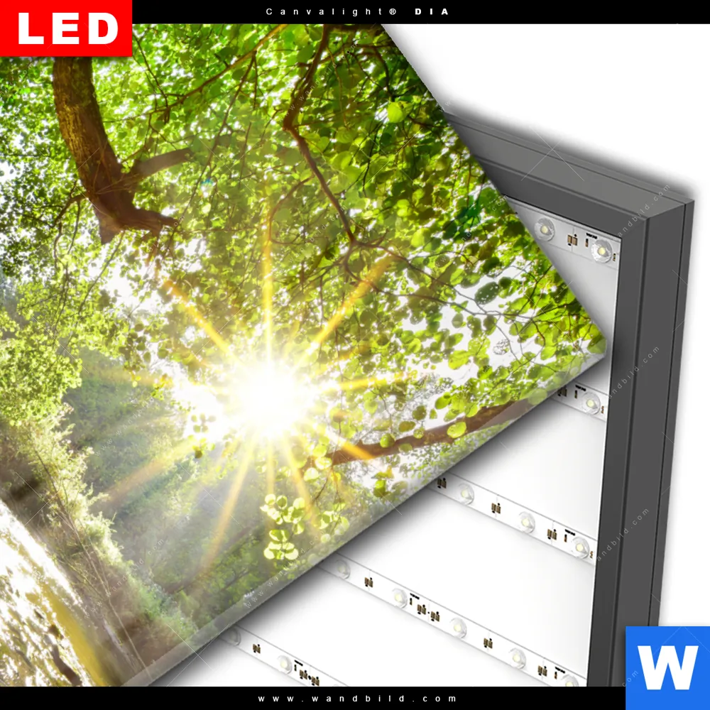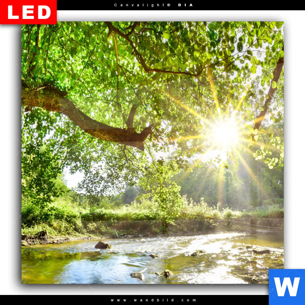 Wechselmotiv Acrylglas Canvalight® DIA | Wald mit Bach bei Sonnenschein | Quadrat