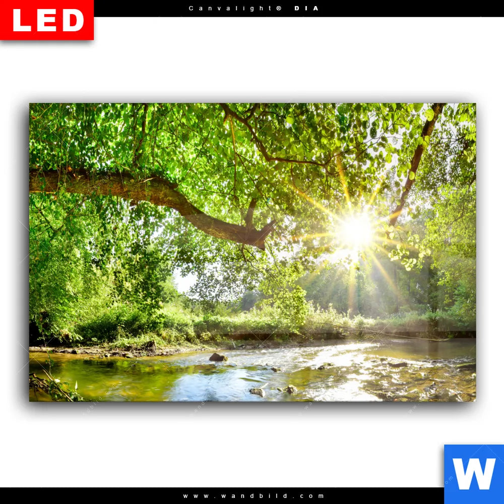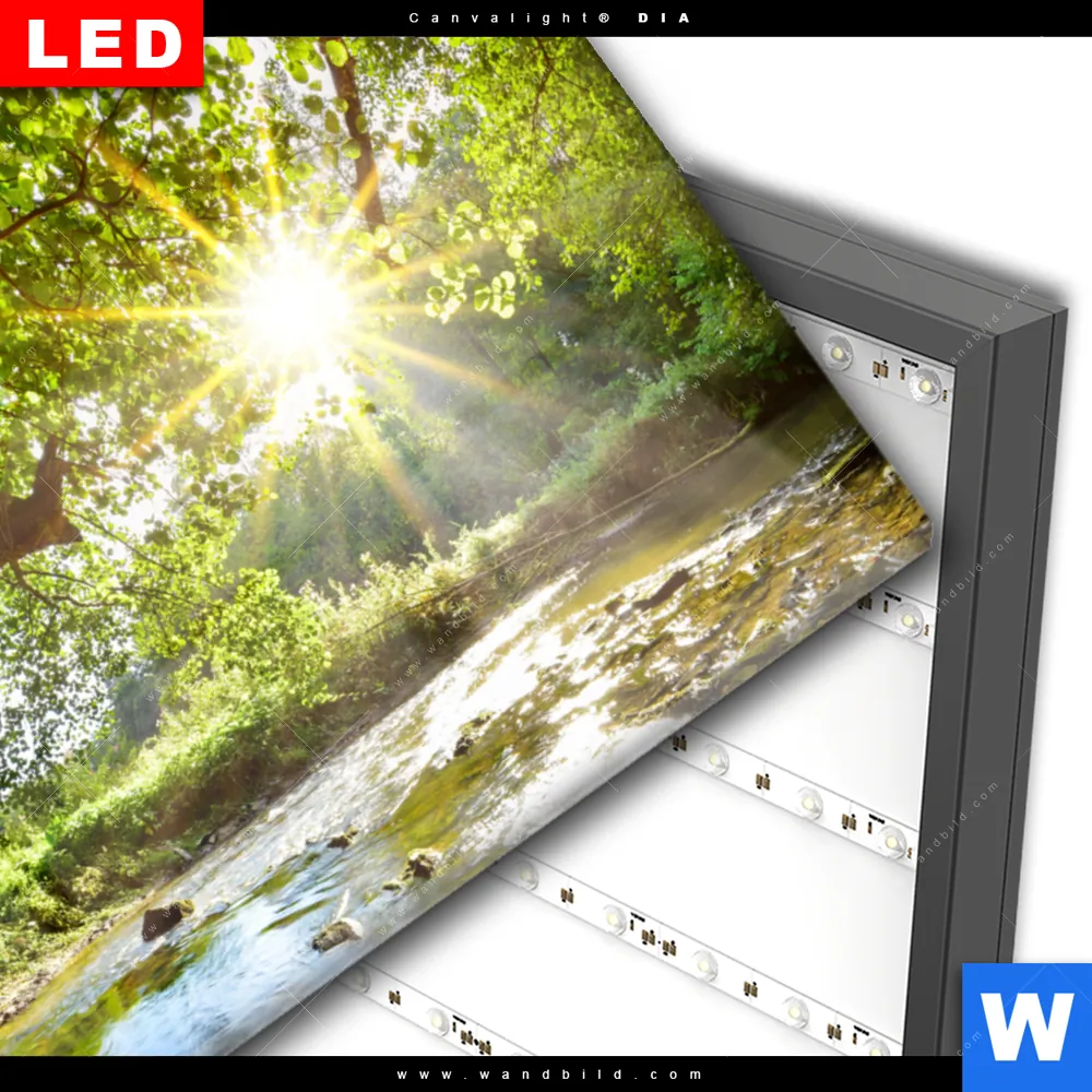 Wechselmotiv Acrylglas Canvalight® DIA | Wald mit Bach bei Sonnenschein | Querformat