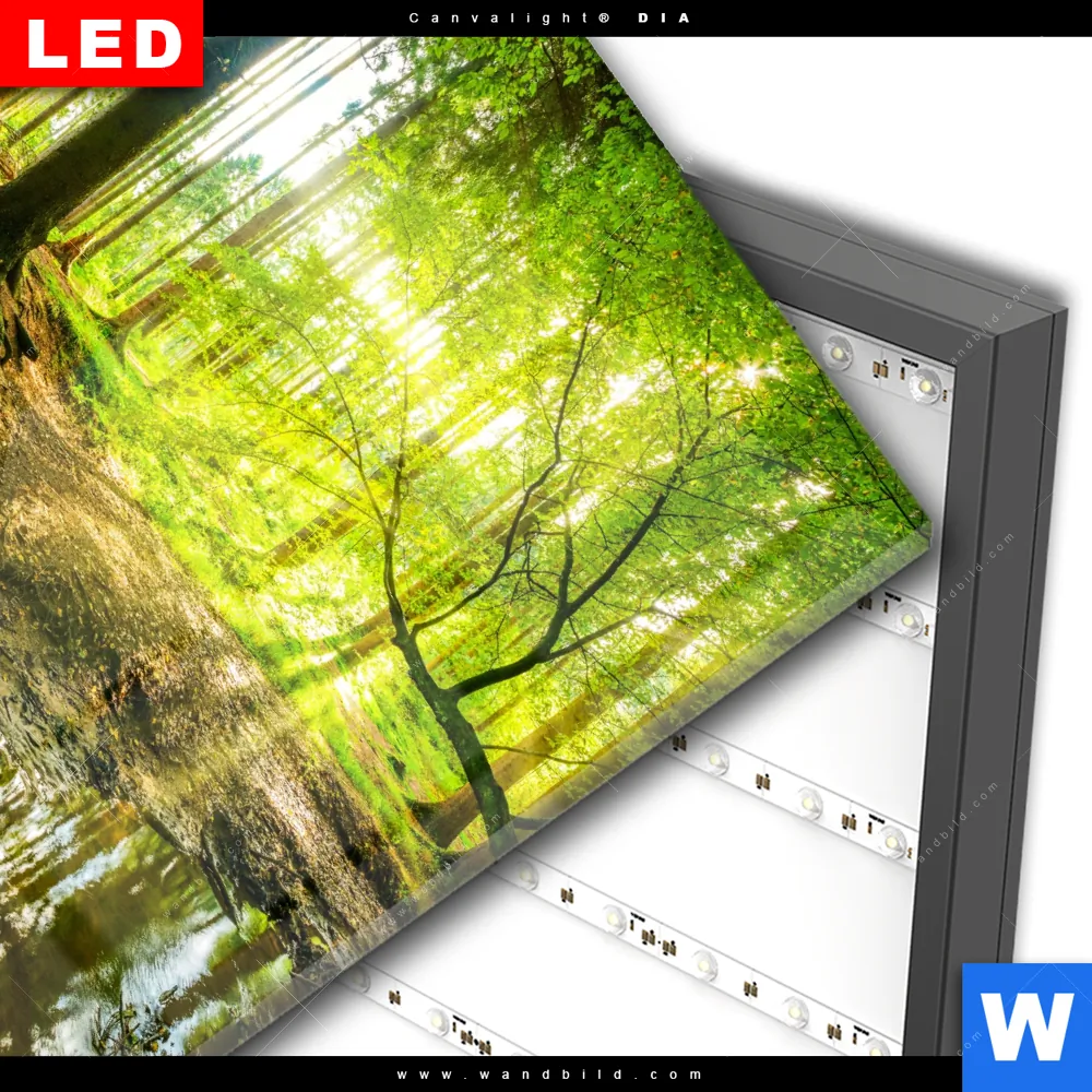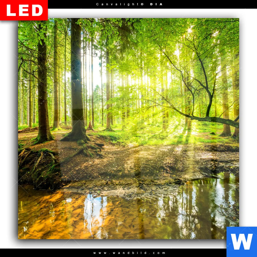 Wechselmotiv Acrylglas Canvalight® DIA | Wald mit Sonnenstrahlen | Quadrat
