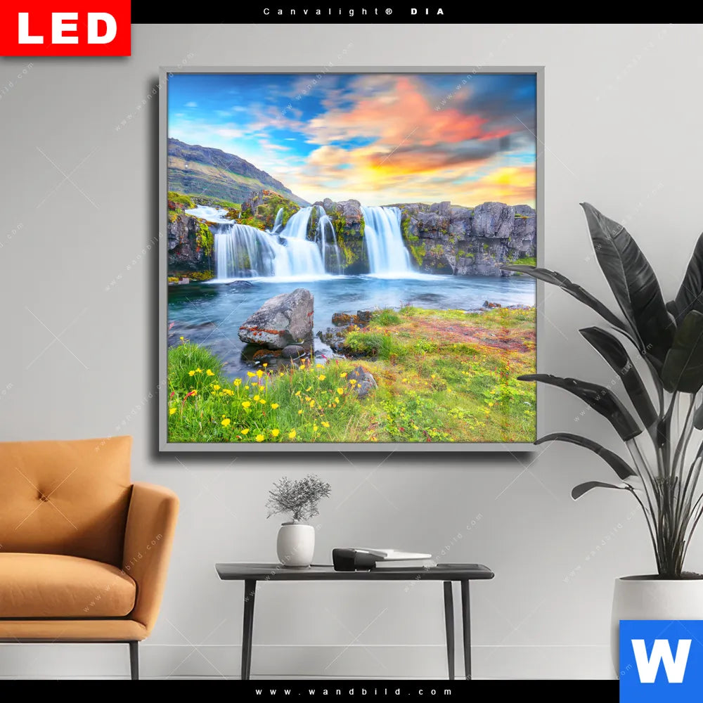 Wechselmotiv Acrylglas Canvalight® DIA | Wasserfall bei Sonnenuntergang | Quadrat