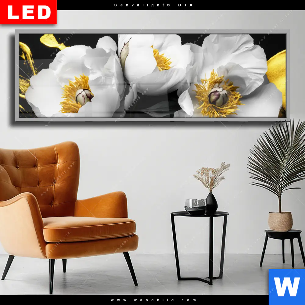 Wechselmotiv Acrylglas Canvalight® DIA | Weiße Blumen mit Gold | Panorama