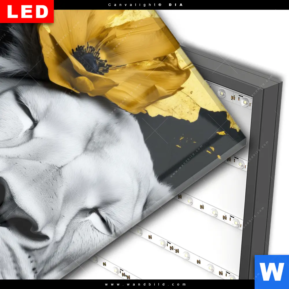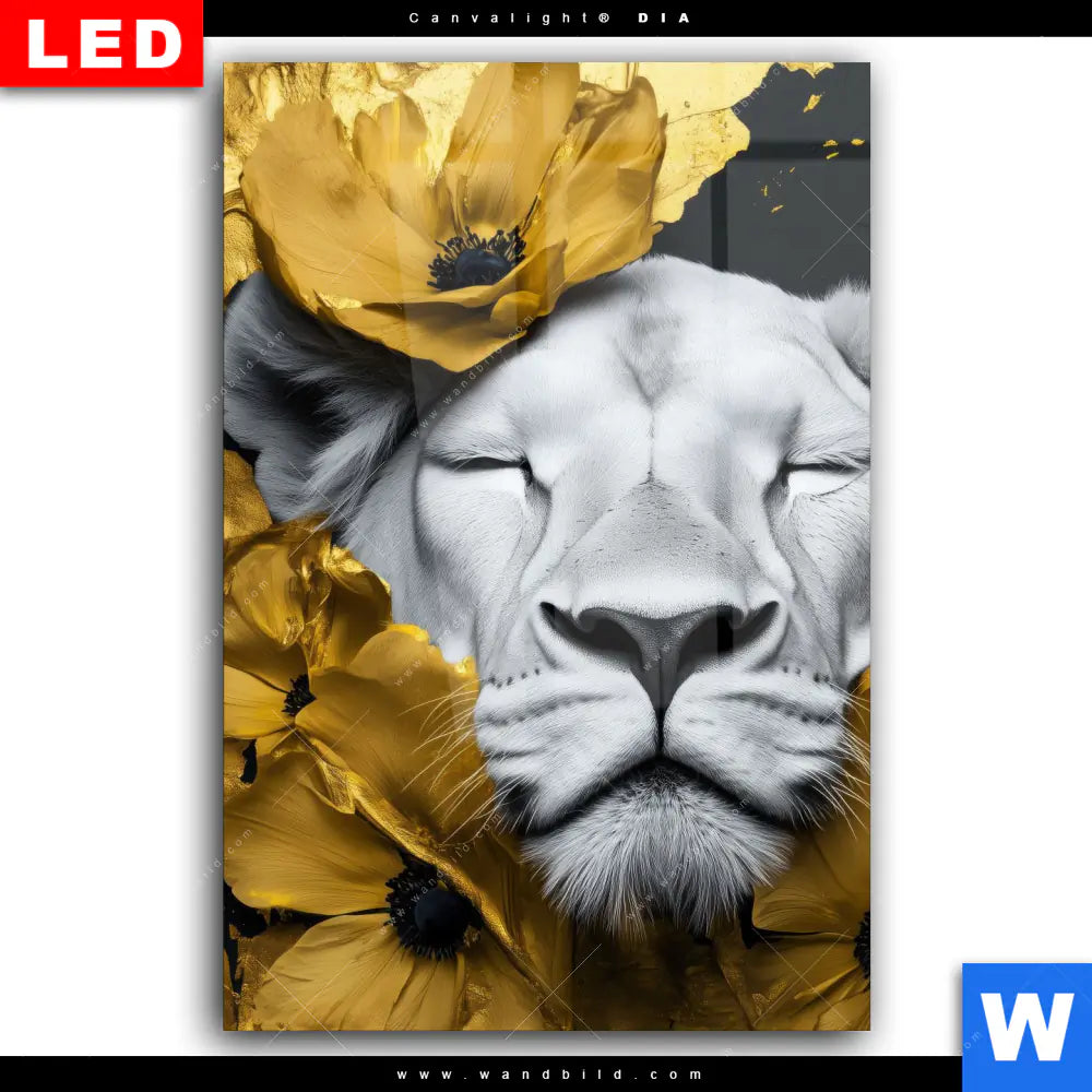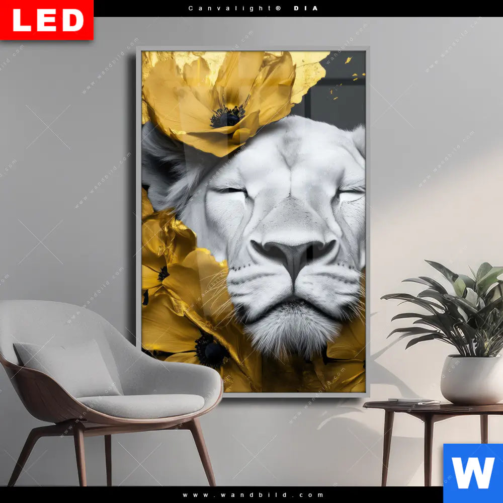 Wechselmotiv Acrylglas Canvalight® DIA | Weiße Löwin mit Goldblüten | Hochformat