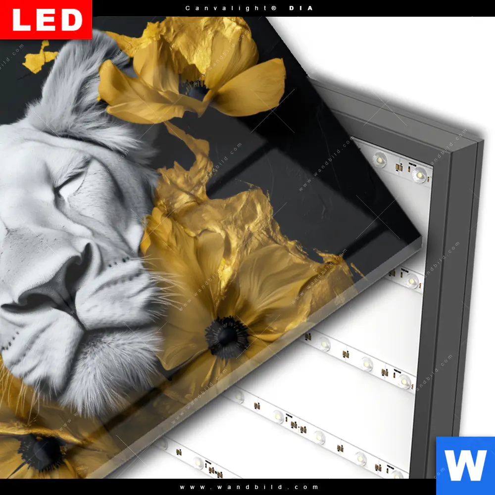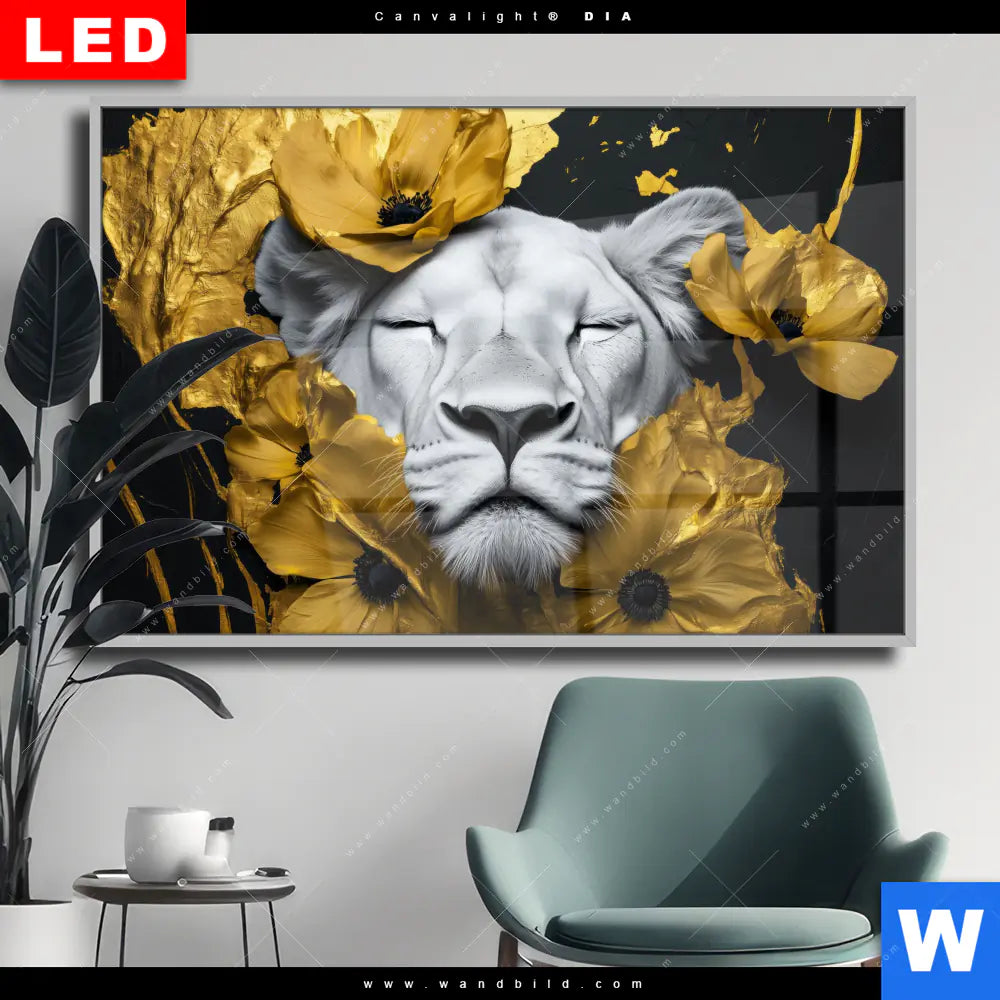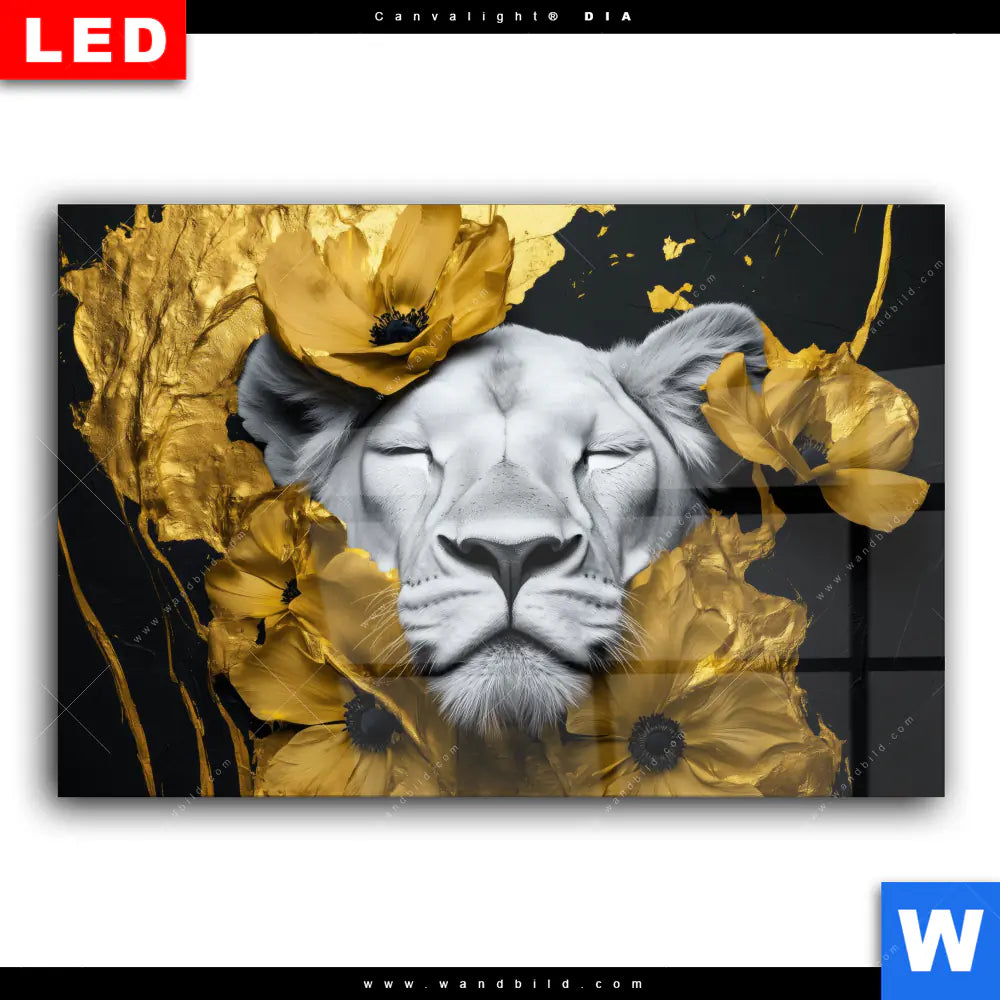 Wechselmotiv Acrylglas Canvalight® DIA | Weiße Löwin mit Goldblüten | Querformat
