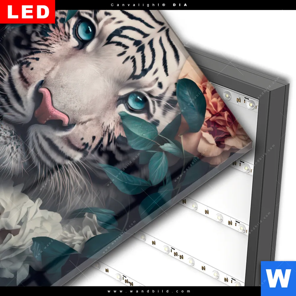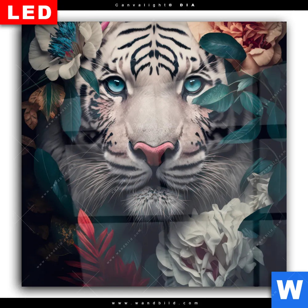 Wechselmotiv Acrylglas Canvalight® DIA | Weißer Tiger mit blauen Augen zwischen Blumen | Quadrat