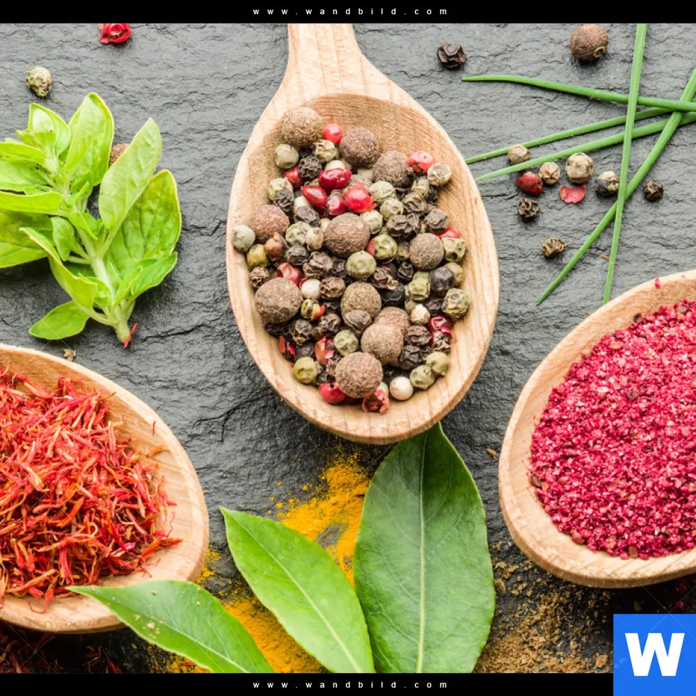 Wechselmotiv | Bunte Gewürze in Holzlöffeln | Querformat