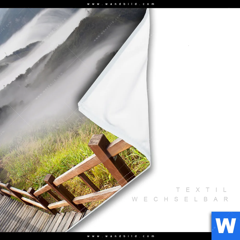 Wechselmotiv Textil | Holztreppe auf Berg mit Wolken | Quadrat