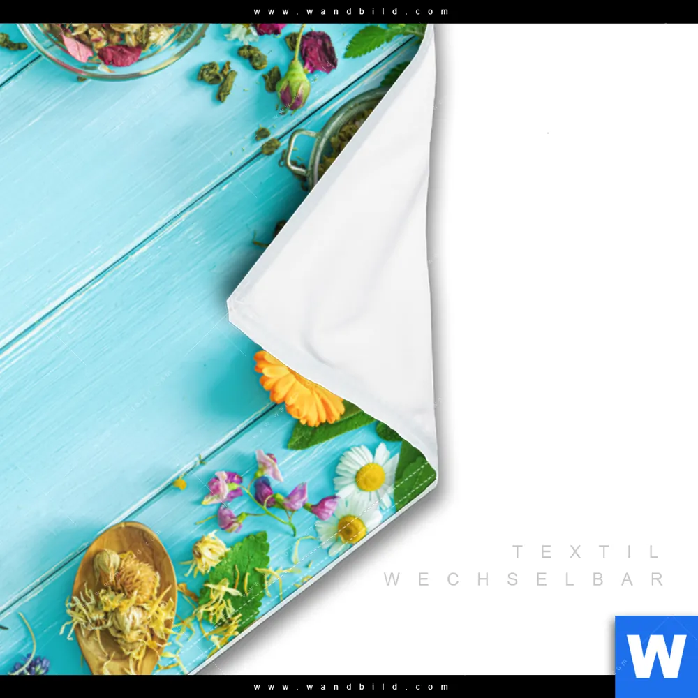 Wechselmotiv Textil | Kräuter auf blauem Holztisch | Hochformat