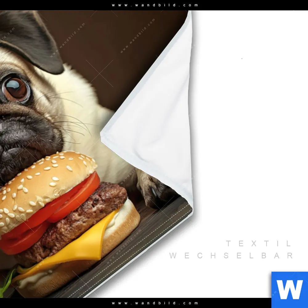 Wechselmotiv Textil | Mops mit Cheeseburger | Querformat