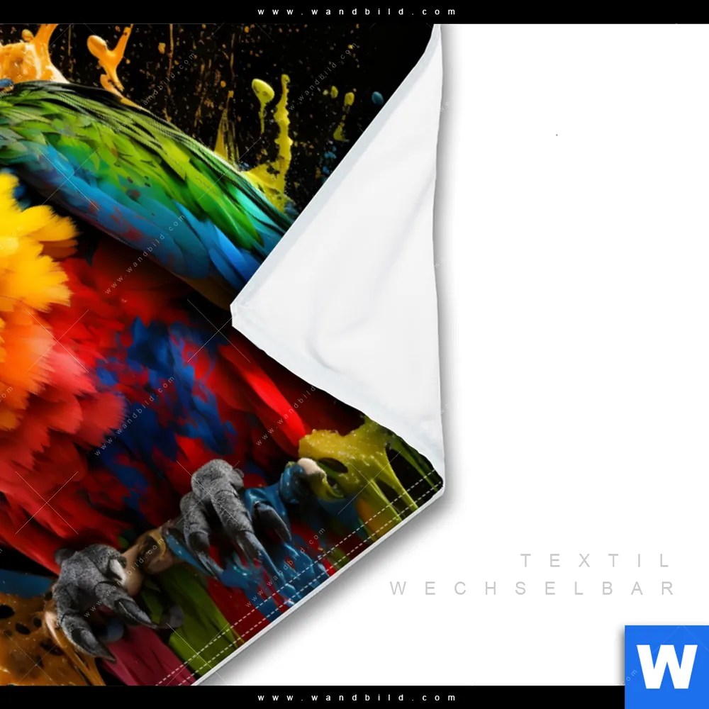 Wechselmotiv Textil | Papagei mit bunten Farbspritzern | Querformat