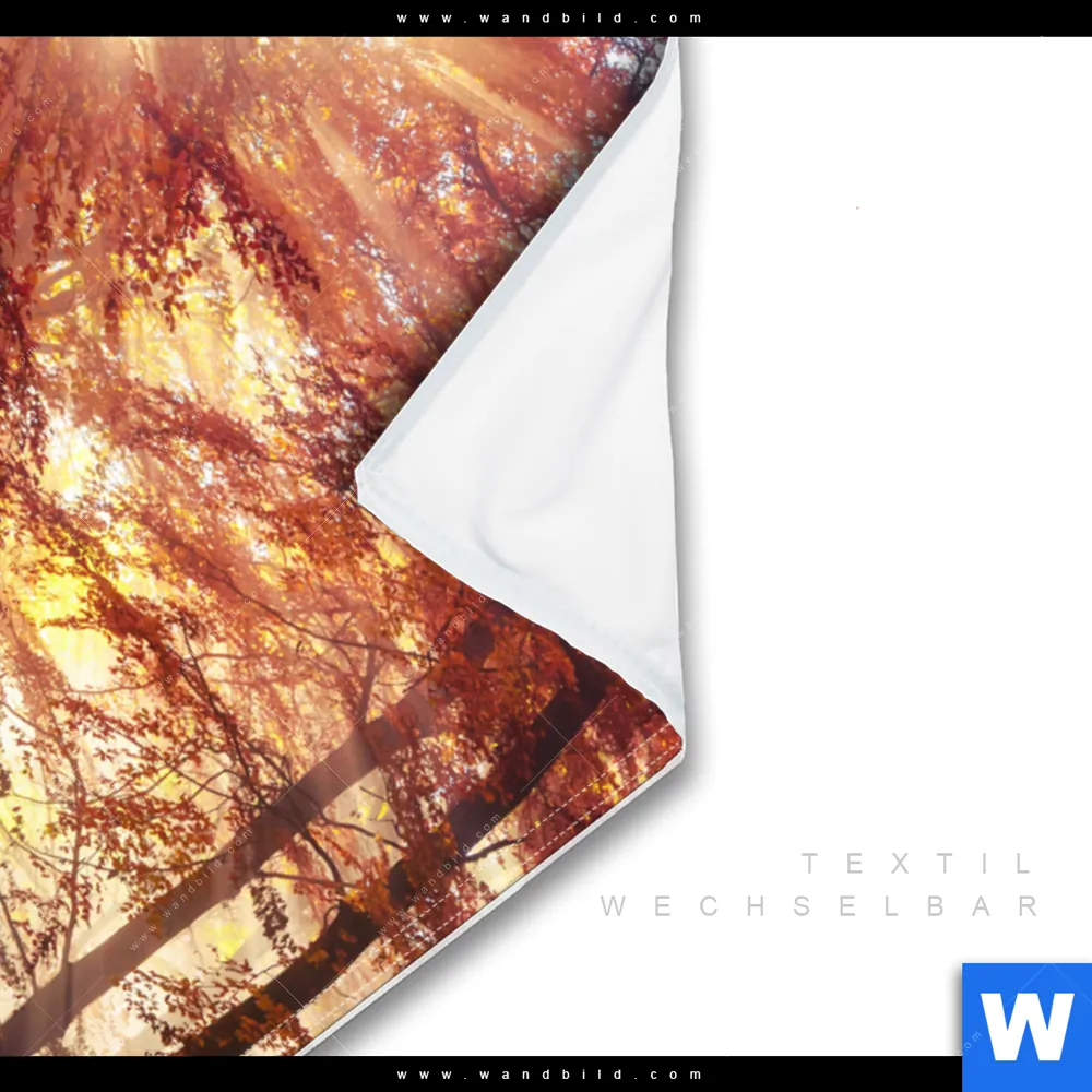 Wechselmotiv Textil | Sonnenlicht im nebligen Wald | Hochformat