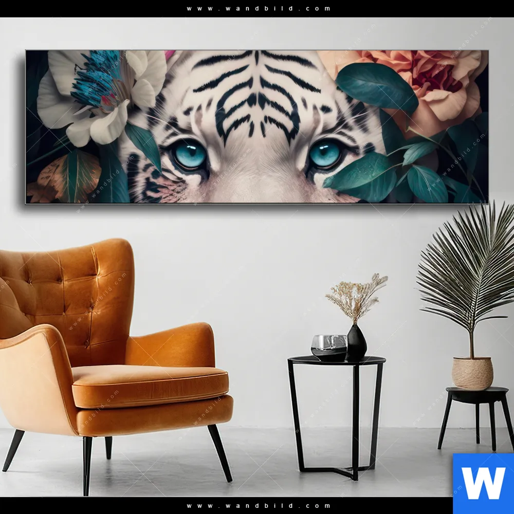 Wechselmotiv | Weißer Tiger mit blauen Augen zwischen Blumen | Panorama