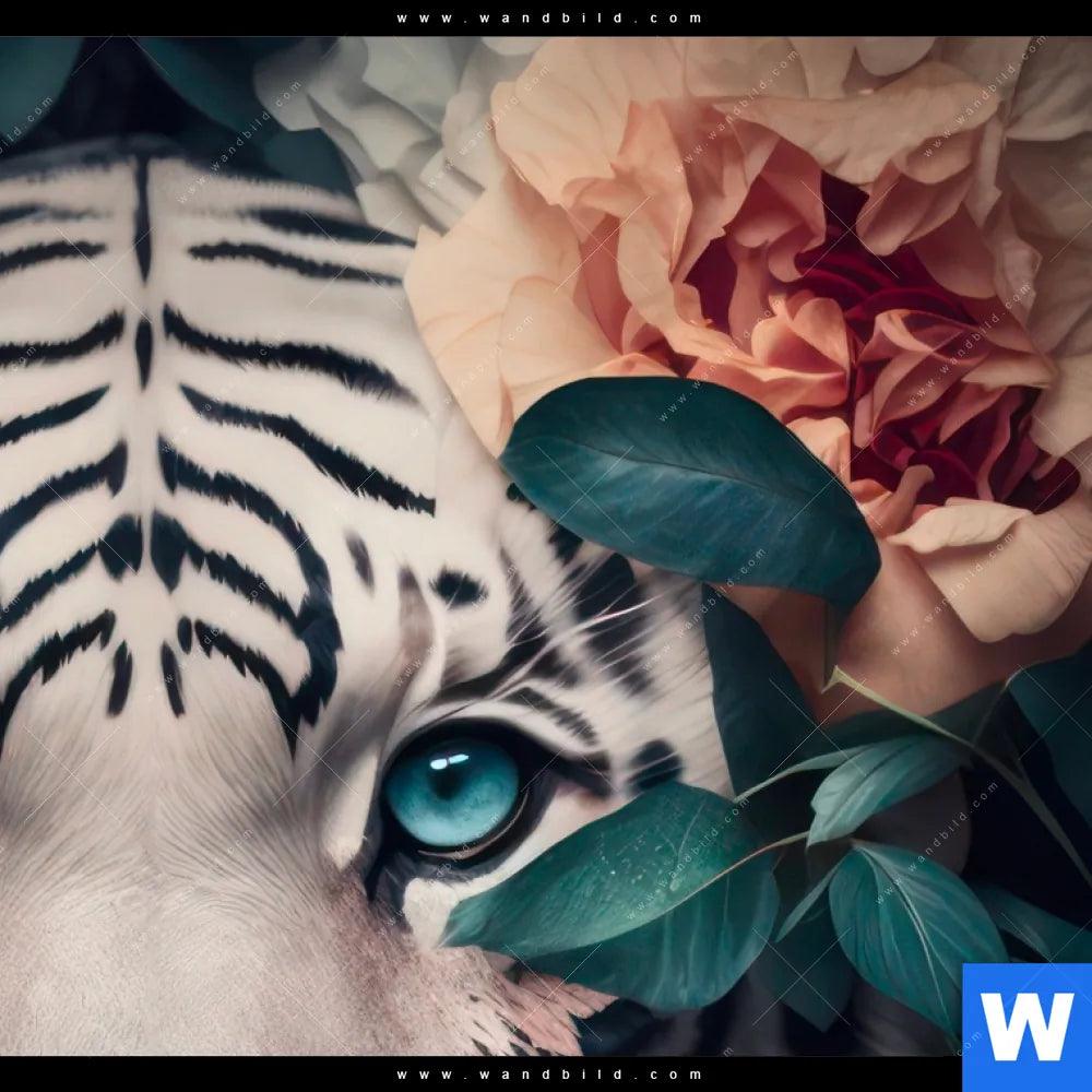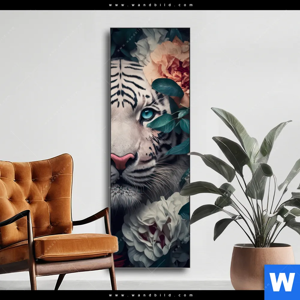Wechselmotiv | Weißer Tiger mit blauen Augen zwischen Blumen | Schmal